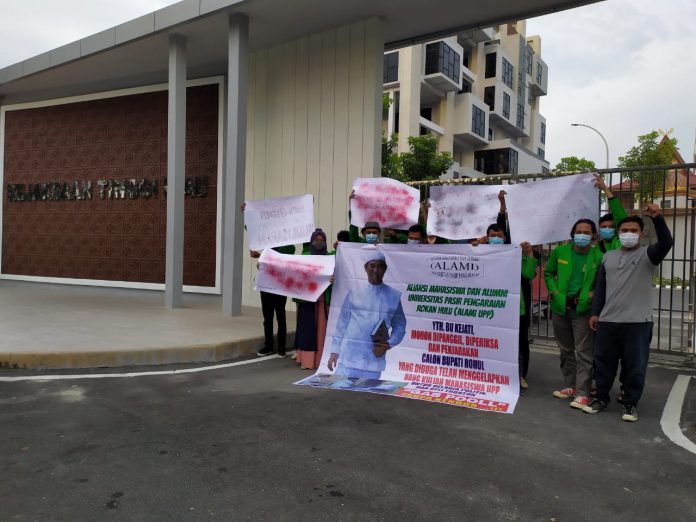 Dalam aksi, mahasiswa tampak membawa spanduk dengan berbagai tulisan, Seperti “kampus UPP bukan milik pribadi, kampus ini milik publik dan lain sebagainya.”