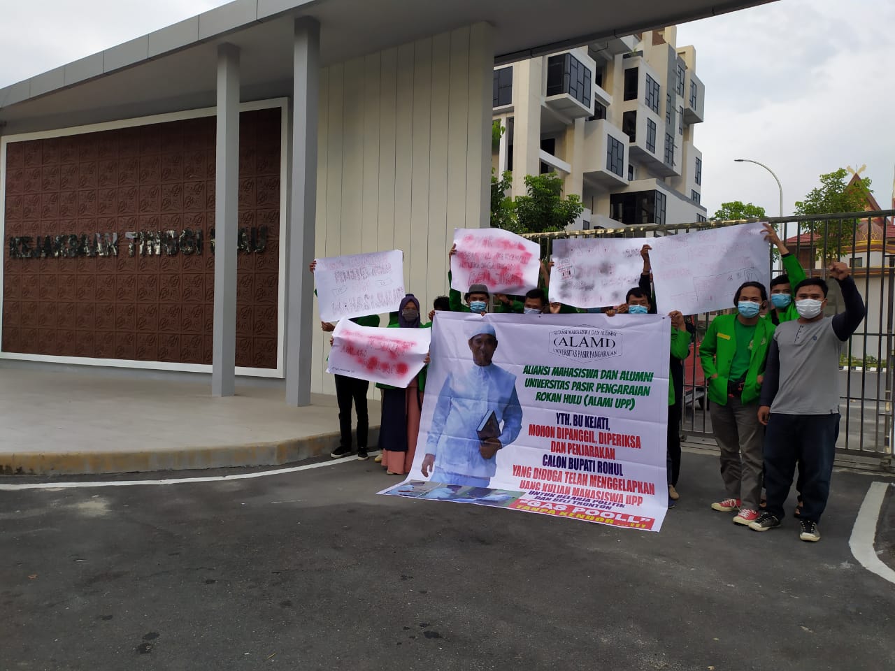 PEKANBARU – Kelompok yang tergabung dalam Aliansi Mahasiswa dan Alumni Universitas Pasir Pengaraian (ALAMI UPP) gelar aksi unjuk rasa di halaman Kejaksaan Tinggi (Kejati) Provinsi Riau di jalan Sudirman Pekanbaru, Rabu (21/10/2020).
