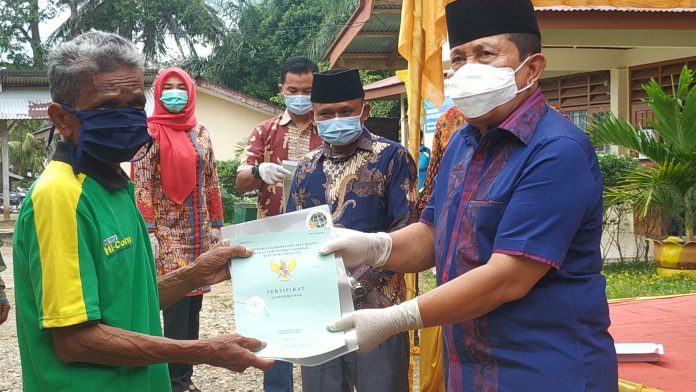 PASIRPENGARAIAN – Hari ini, Minggu (14/06/2020), Bupati kabupaten Rokan Hulu menyerahkan sertifikat lahan melalui Program Tanah Objek Reforma Agraria (Tora) kepada masyarakat eks transmigrasi di Desa Pasir Utama, Kecamatan Rambah Hilir, Kabupaten Rokan Hulu (Rohul), di Kantor Desa Pasir Utama sekitar pukul 10.00 WIB.