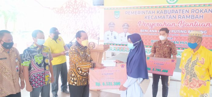 PASIRPENGARAIAN – Melalui Dana Belanja Tidak Terduga (BTT) tahun 2021, Bupati Rokan Hulu (Rohul), H Sukiman serahkan secara langsung bantuan kepada korban Bencana Alam Angin Puting Beliung yang terjadi pada beberapa bulan di Kecamatan Rambah, Rokan Hulu.
