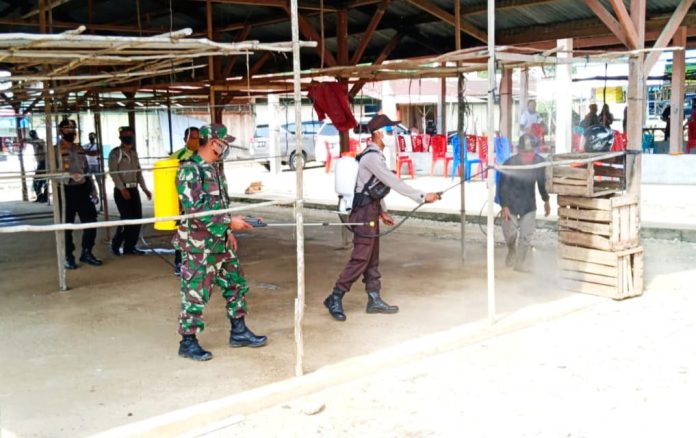 PASIRPENGARAIAN – Dalam rangka mencegah dan mengantisipasi penyebaran virus corona atau Covid-19, Jajaran TNI-Polri dan Pemerintah Kecamatan Rambah melakukan penyemprotan cairan desinfektan di los Pasar Minggu Boter Desa Rambah Tengah Hilir Kecamatan Rambah Kabupaten Rokan Hulu, Sabtu (27/06/2020).