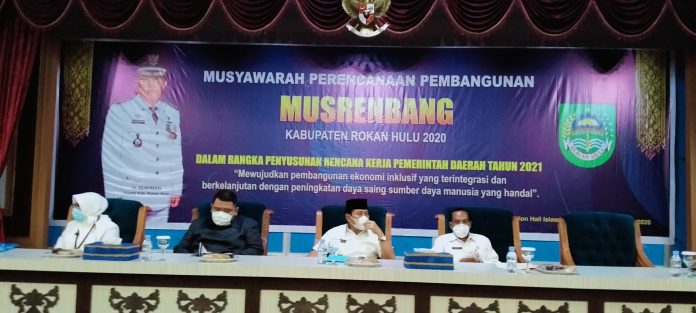 PASIRPENGARAIAN – Dalam acara Musyawarah Perencanaan Pembangunan (Musrenbang) Kabupaten Rokan Hulu, Bupati Rohul, H Sukiman dan seluruh hadirin yang hadir menggunakan masker dalam antisipasi pencegahan virus Corona Covid-19. Rabu (18/03/2020) di Hall Madani Islamic Center, Pasir Pengaraian, Sekitar pukul 11.00 WIB.
