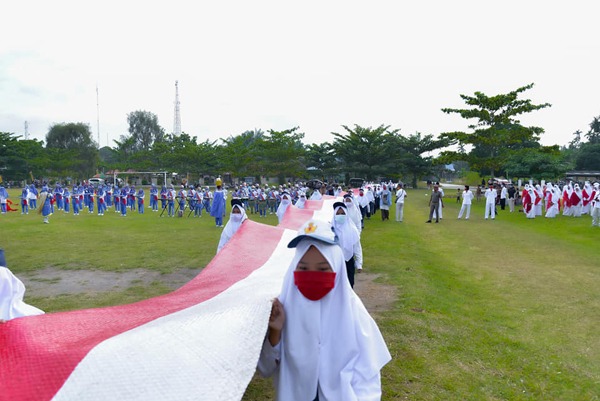 Pembentangan Anyaman Bendera Merah Putih yang memiliki panjang 75 Meter itu menjadi pusat perhatian peserta Upacara di Kepenuhan Hilir, Senin (17/08/2020) pagi.