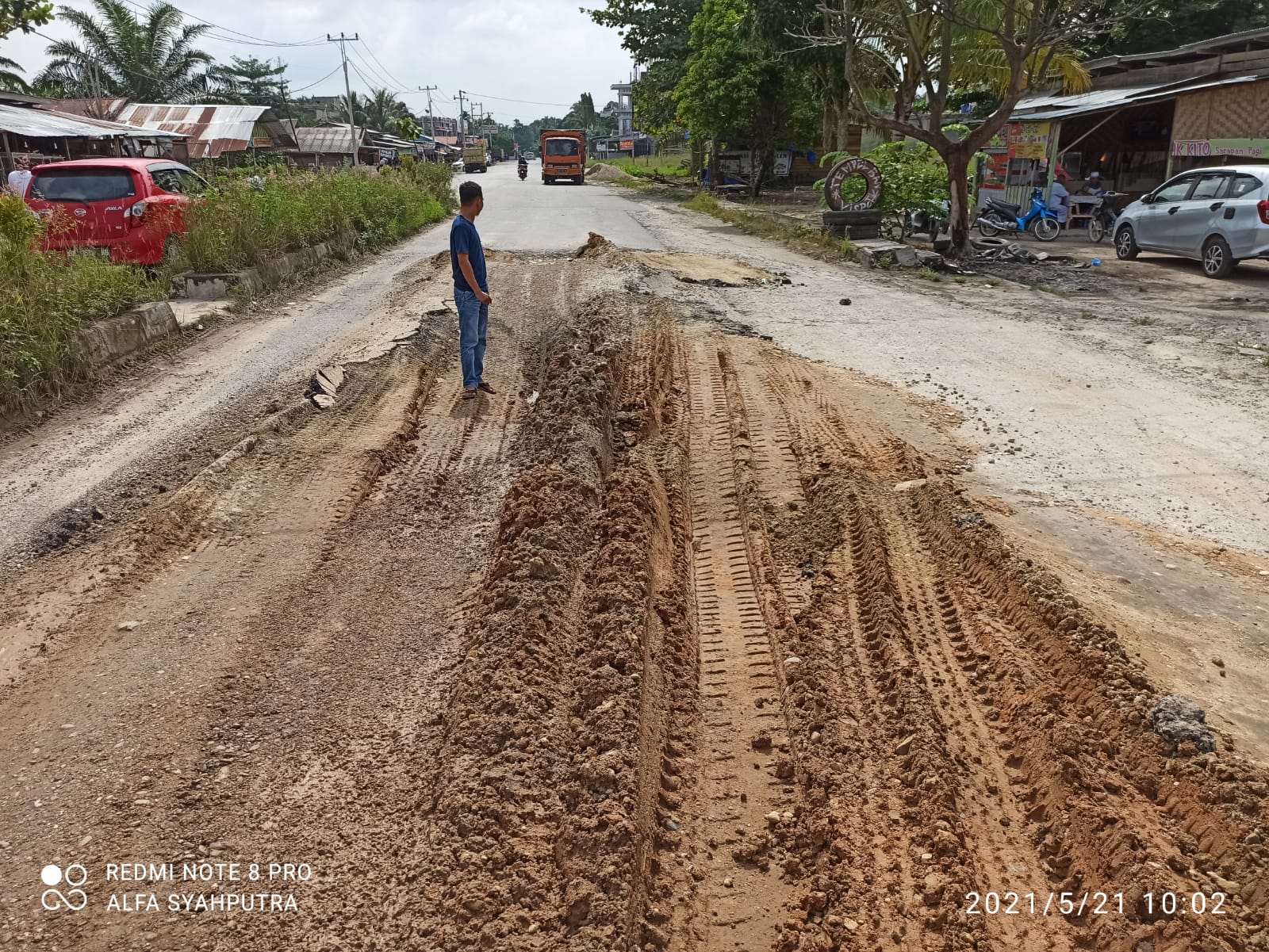 Jalan yang rusak tersebut merupakan wewenang Pemerintah Provinsi Riau dan kini rusak dan berlubang hingga setinggi lutut orang dewasa.