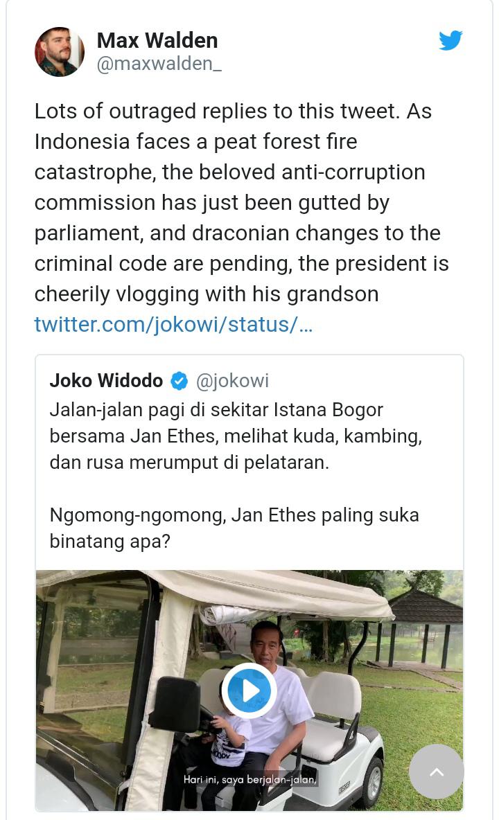 “Ketika Indonesia menghadapi bencana kebakaran hutan gambut, komisi antikorupsi yang tercinta ini baru saja dimusnahkan parlemen, dan perubahan kejam terhadap kode kriminal sedang tertunda, presiden dengan riang ngevlog bareng cucunya,” cuit Max Walden.