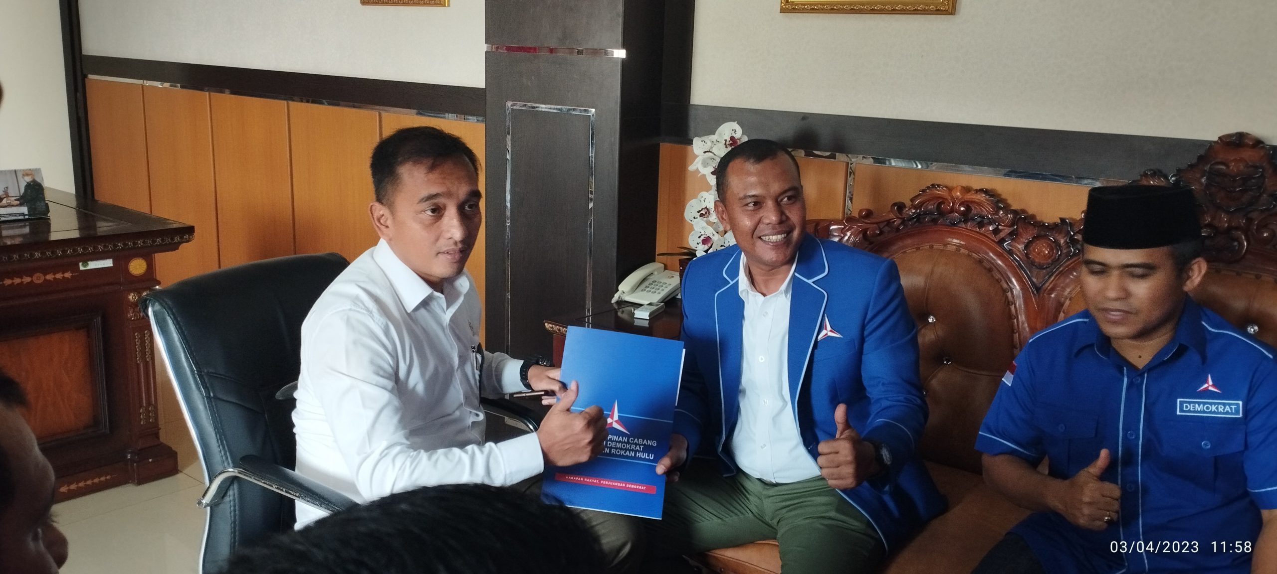 Dengan mengenakan jas berwarna biru, Kelmi Amri bersama pengurus DPC Partai Demokrat Rohul lainnya tampak kompak mendatangi Gedung PN Pasir Pengaraian yang terletak di Komplek Pemda, Pasir Pengaraian, Senin (03/04) pagi.