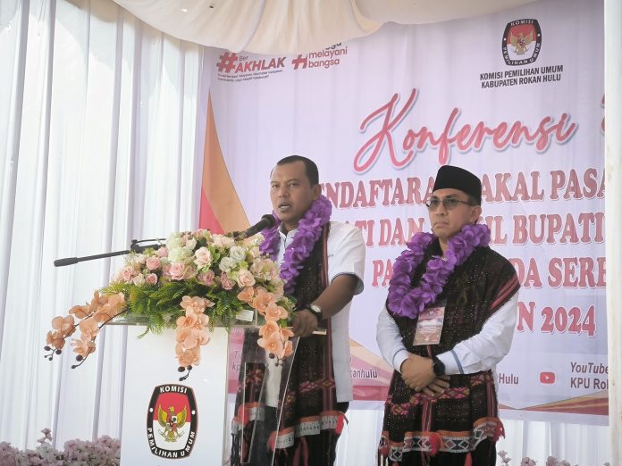 PASIRPENGARAIAN – Kelmi Amri dan Asparaini menjadi pasangan Bakal Calon (Balon) Bupati dan Wakil Bupati Rokan Hulu (Rohul) pertama yang menyambangi kantor Komisi Pemilihan Umum Daerah (KPUD) Kabupaten Rokan Hulu guna melakukan pendaftaran pada Pemilihan Kepala Daerah (Pilkada) Kabupaten Rokan Hulu tahun 2024, Rabu (28/08).