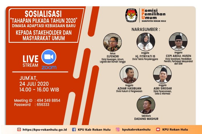 PASIRPENGARAIAN – Komisi Pemilihan Umum (KPU) mengelar rapat Sosialisasi Tahapan Pilkada 2020 Rokan Hulu di masa adaptasi kebiasaan baru secara daring.