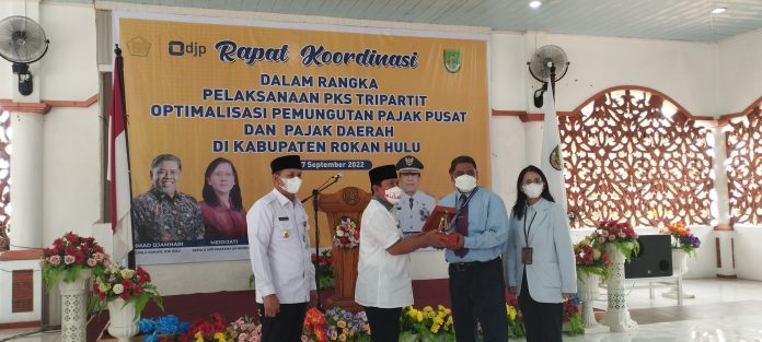 PASIRENGARAIAN – Kantor Wilayah (Kanwil) DJP Riau bersama Kantor Pelayanan Pajak (KPP) Pratama Bangkinang dan Pemerintah Daerah Rokan Hulu (Rohul) menyelenggarakan kegiatan Rapat Koordinasi Program Optimalisasi Pemungutan Pajak Pusat dan Pajak Daerah di Pendopo Rumah Dinas Bupati Kabupaten Rohul. Kegiatan tersebut dihadiri oleh Kepala Kantor Wilayah DJP Riau Ahmad Djamhari dengan didampingi oleh Kepala Kantor Pelayanan Pajak Bangkinang Meidijati dan Kepala Penyuluhan Pelayanan dan Hubungan Masyarakat Kanwil DJP Riau Asprilantomiardiwidodo dari pihak DJP sedangkan dari pihak Pemerintah Kabupaten Rokan Hulu dihadiri oleh Bupati Rohul Sukiman, Wakil Bupati Rohul Indra Gunawan dan jajaran organisasi perangkat daerah di lingkungan Rohul., Rabu (07/09), di Pendopo Rumah Dinas Bupati.