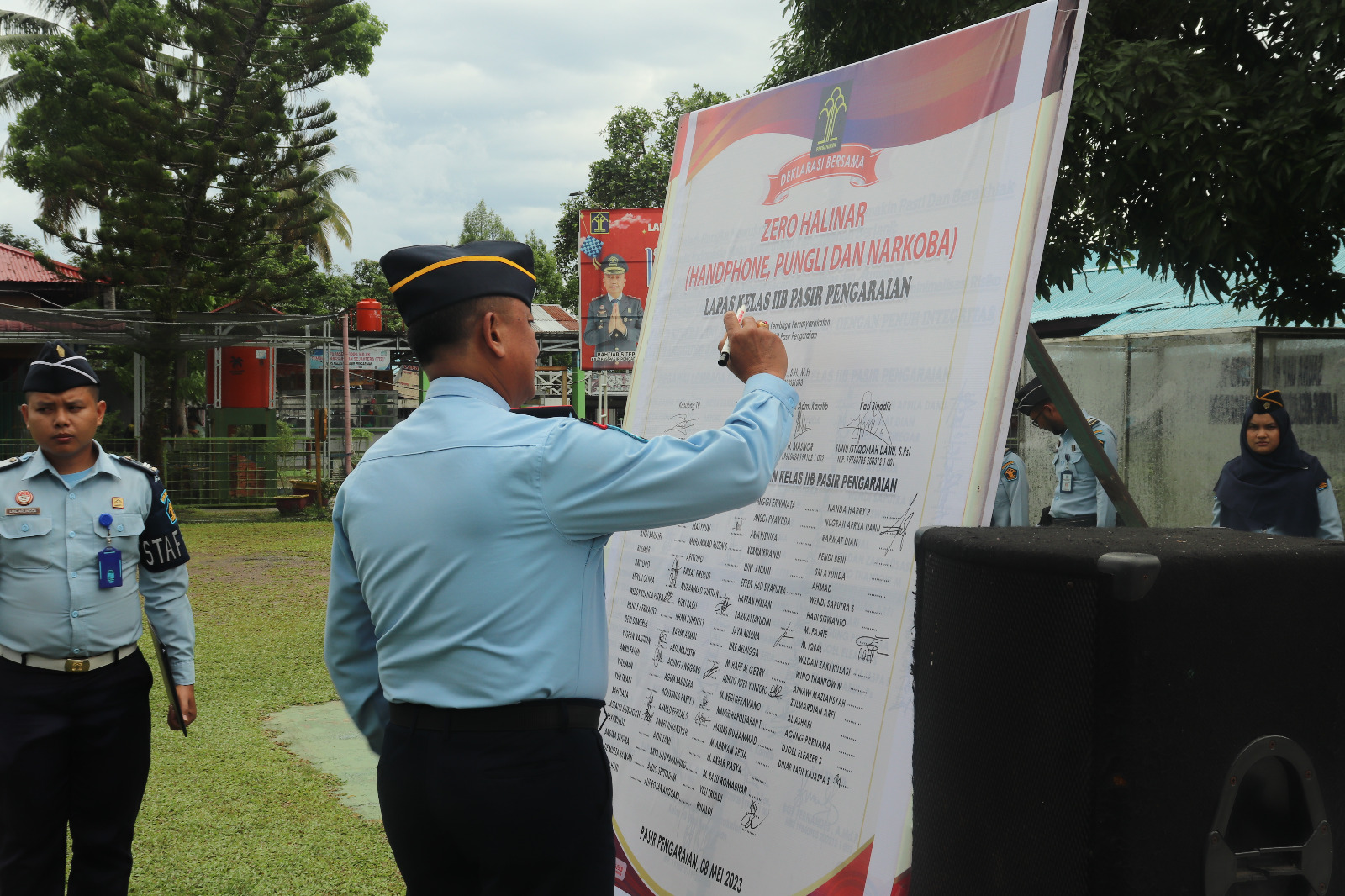 Diakhir Apel, dilaksanakan penandatangan komitmen bersama tidak terlibat Narkoba yang dimulai dari Pejabat Struktural serta seluruh Petugas Lapas Pasir Pengaraian.
