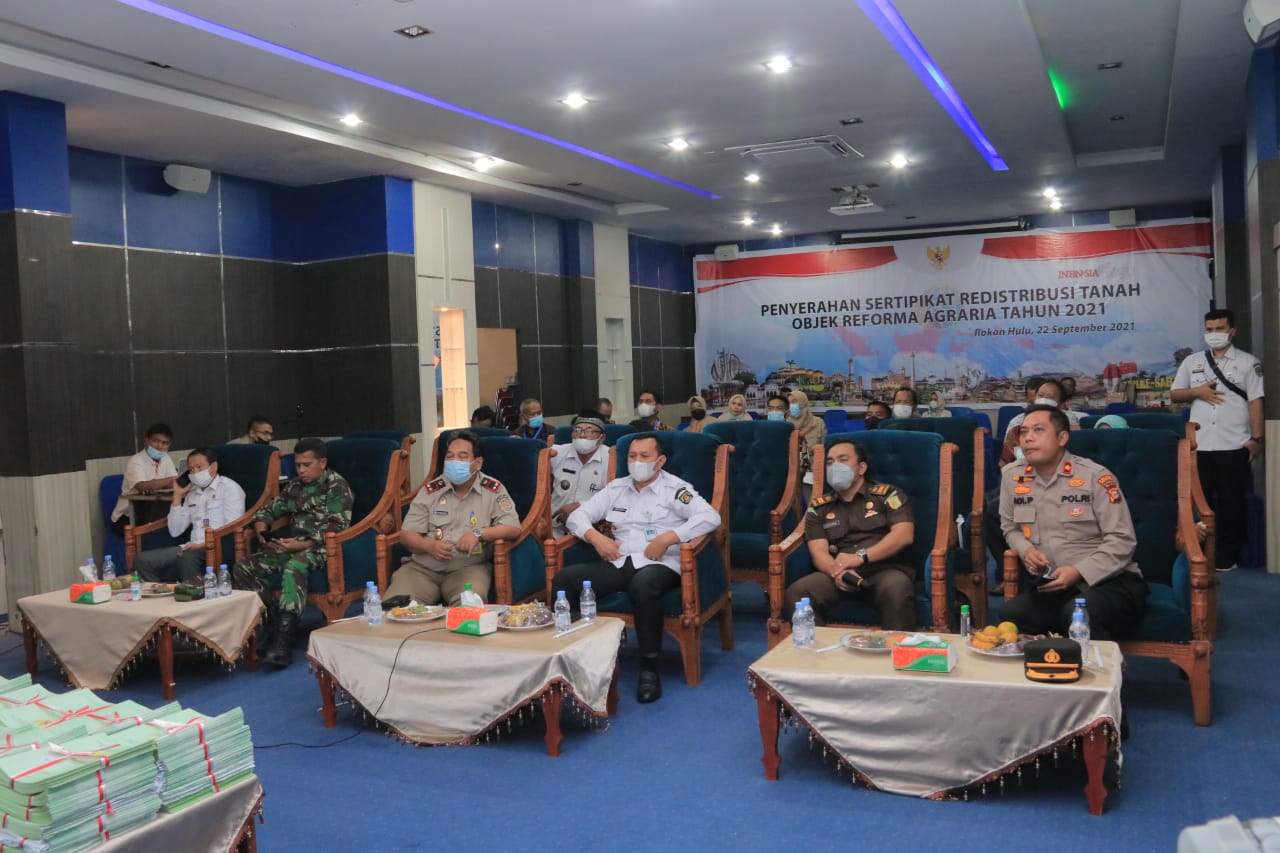 Turut hadir mengikuti kegiatan penyerahan sertifikat Redistribusi Tanah Oleh Presiden Republik Joko Widodo melalui virtual, Kapolres Rohul AKBP Eko Wimpiyanto Hardjito SIK yang diwakili oleh Waka Polres Rohul Kompol Adi Prabowo SIK, Kakan BPN Rohul Rosidi, Asisten 1 Erpan Dedi Sanjaya, Danramil 02 Rambah Kapten Inf Khasmir, Perwakilan Kejaksaan Negeri Rokan Hulu serta Masyarakat penerima Sertifikat.