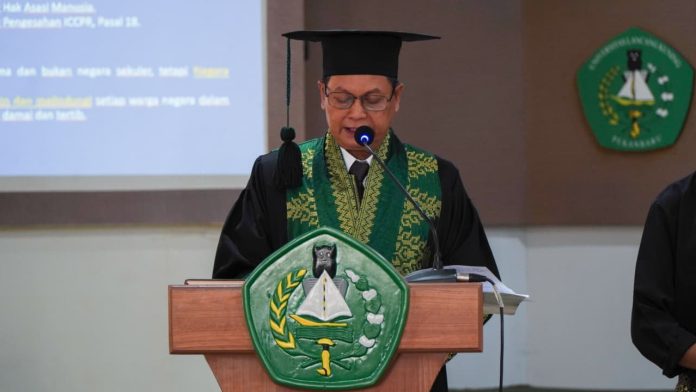Dalam pidato orasi ilmiahnya yang berjudul “Perlindungan Kebebasan Beragama dan Hak Mendirikan Rumah Ibadah sebagai Instrumen Keadilan dan Keharmonisan Sosial,” Prof. Ardiansah menekankan pentingnya perlindungan hak-hak fundamental sebagai landasan keharmonisan masyarakat dan keadilan sosial.