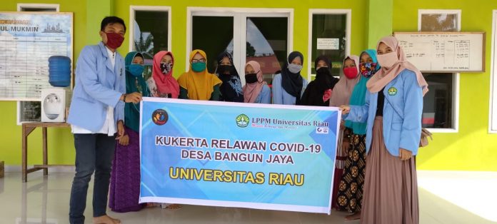 PASIRPENGARAIAN – KKN Relawan Covid-19 Universitas Riau (UNRI) Desa Bangun Jaya Membuat dan Membagikan Handsanitizer dari Bahan Alami secara gratis Kepada Warga, Kamis (09/07/2020).
